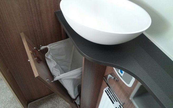 At the forward end of the washroom a laundry bag is located under the bowl type washbasin. Whilst the built-in laundry bag isn’t a new idea its inclusion is a good idea in such a small space. A radiator for the Alde central heating lives next to the toilet under the toilet roll holder!