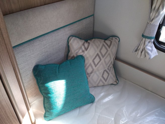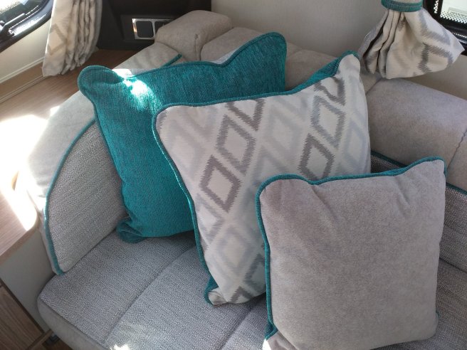 The same colour scheme is carried on inside with teal coloured piping, scatter cushions and throws for the two beds. At the front the seats can be made into a 4’7″ wide double bed.