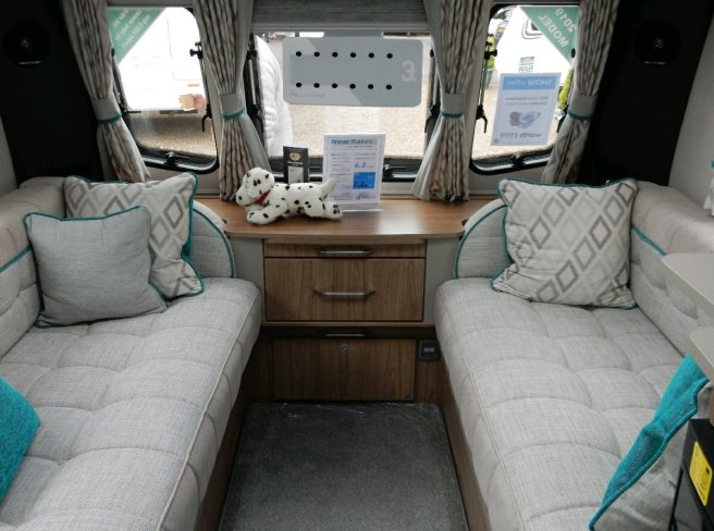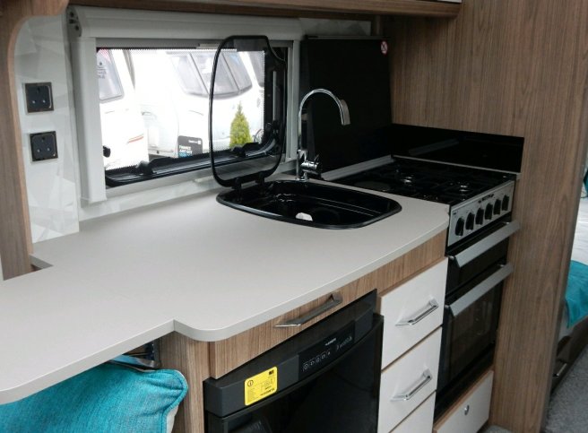 The kitchen is as per the standard VIP with a Dometic oven, fridge and Daewoo microwave. New for 2019 are an additional 230v socket and a lift up extension worktop. There is also a removable draining board as standard which is not shown on this display model.