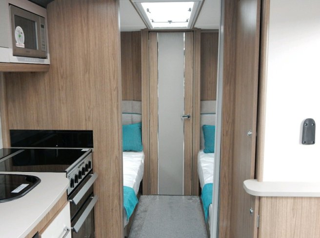 Looking towards the rear, a folding door separates the bedroom area from there rest of the caravan. This partition fits next to the wardrobe.