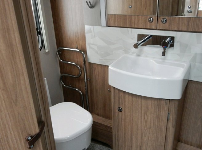 In the washroom, the Dometic toilet is to the left and the shower is to the right. The towel rail is heated as part of the Alde central heating. Behind the mirrored doors there is a shallow cupboard with a shelf.