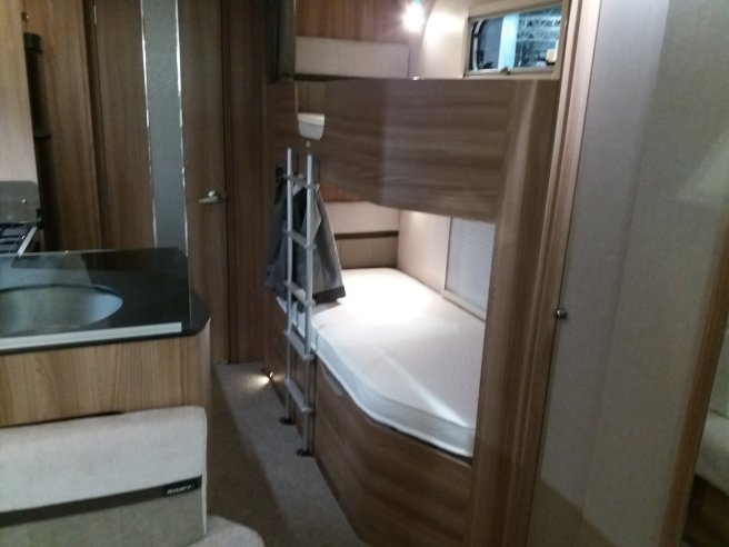 Just past the wardrobe are two fixed bunks, again with Duvalay mattresses and each bunk has a window and individual curtains. The width of the bunks are generous of a caravan at 2’8″ for the top and 2’7″ for the lower bunk. Each bunk is 5’10” long.