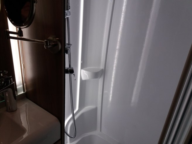 Across the rear the washroom again is pure Swift in style with Thetford toilet to the left and shower to the right. A heated towel rail comes as expected here.