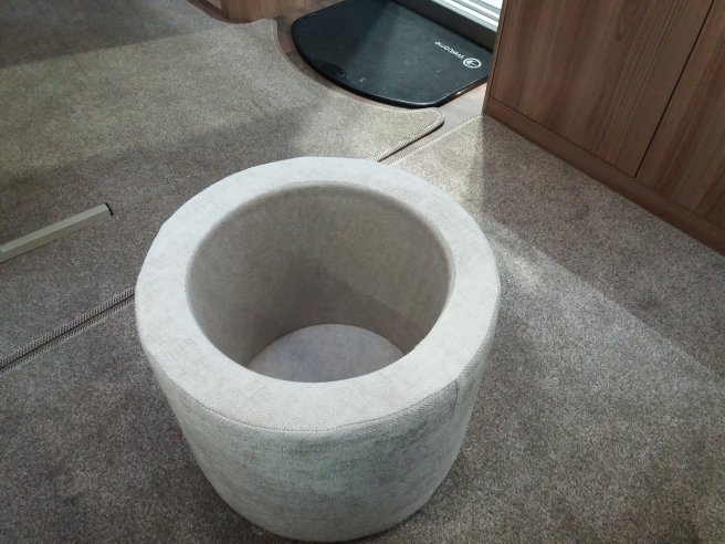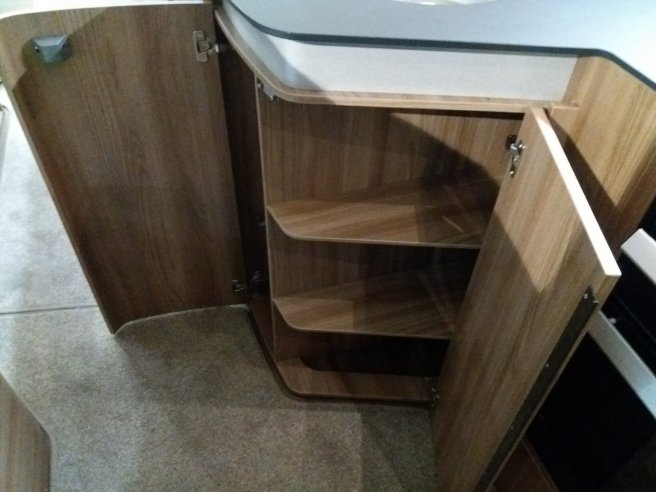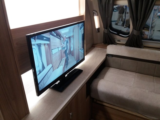 Once inside the Swift Elegance Grande 655 the reason for the unusual windows layout become clear. Across the front there is an L shaped seating layout with what could be called a TV sideboard. L shaped seating seams to coming back into fashion again after this style of lounge returned in the 1990s. There is a handy round footstool that comes with a removable lid of extra storage and another seat.