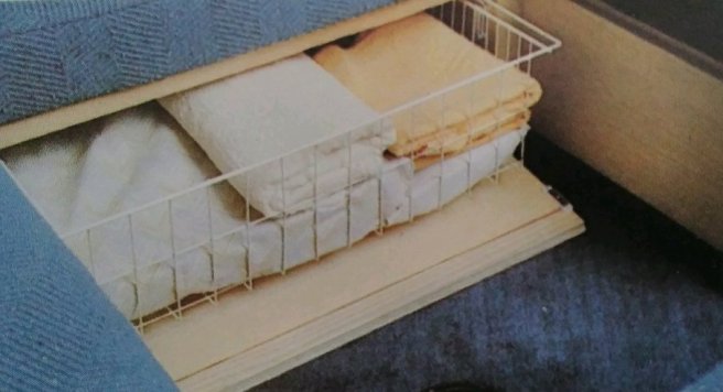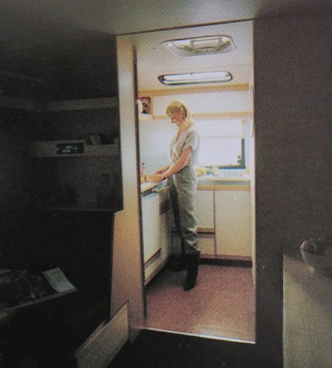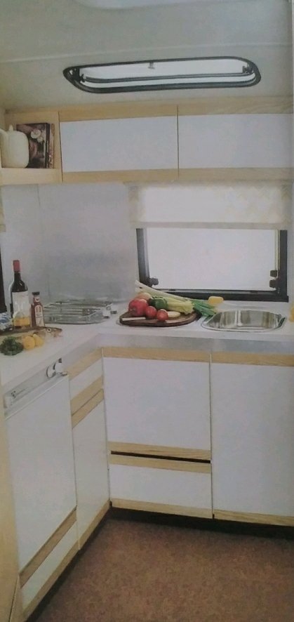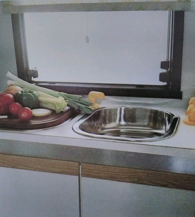 A 60 litre Electrolux fridge which now would be classed as small, in 1982 this was a luxury item. The worktops and cupboard doors were finished in white melamine with natural ash features. A roof window and two side windows allowed for plenty of ventilation.