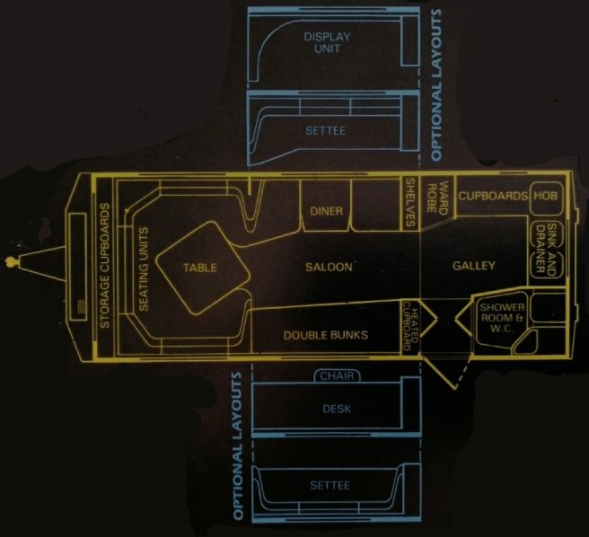 The option of having a desk or display unit may appear unusual, however the Admiral was an unusual caravan. It was designed so that it could also be used as a mobile office, whether this actually attracted new customers is unknown, however one caravan dealer, South Yorkshire Caravans (now part of the Marquis group) had a Bessacarr Admiral as a hospitality unit for many years.