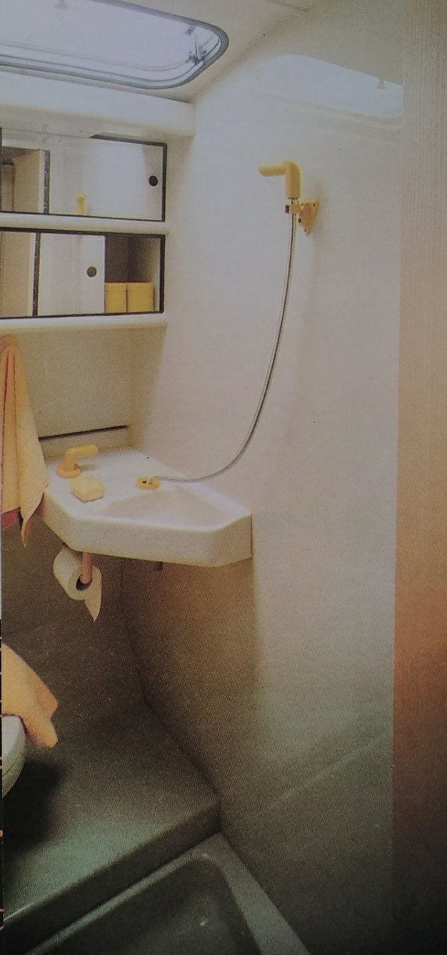 The washroom featured a Theford “Aqua-Magic” flush toilet where the contents went into a holding tank before being transferred into a portable outside container for disposal. This was before of the invention of the Thetford Cassette toilet.