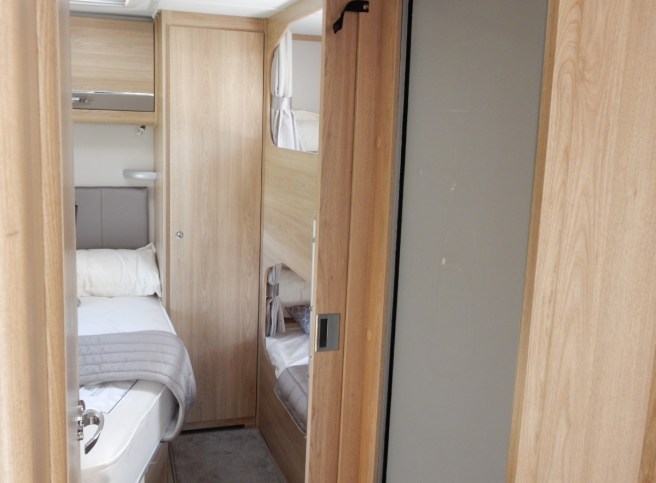 At the other end of the range the 8′ wide 868 models use a continental layout not seen before by a UK manufacturer. unusually, at the rear of the caravan is a side French double bed next to bunk beds, separated by a wardrobe.