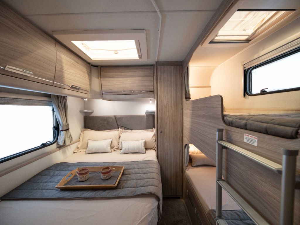 The Laser 665 for 2023 has a revised layout with a new washroom layout where the wardrobe and washbasin have changed positions. The 665 is the only Laser madel that is 7’7″ wide.